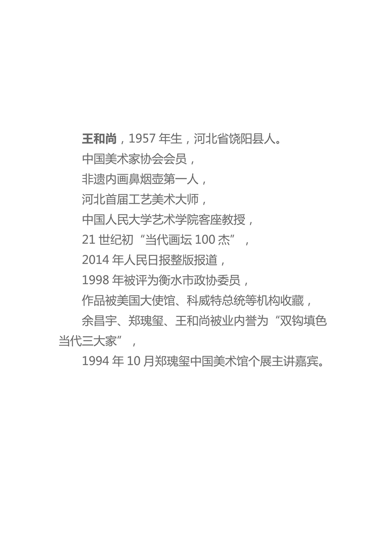 王和尚,1957年生,河北省饶阳县人,自幼酷爱美朮,1982年从事内画艺朮创作,1998年被评为衡水市政协委员,中国美术家协会会员,中华艺朮研究院国画院副院长,国家一级美朮师